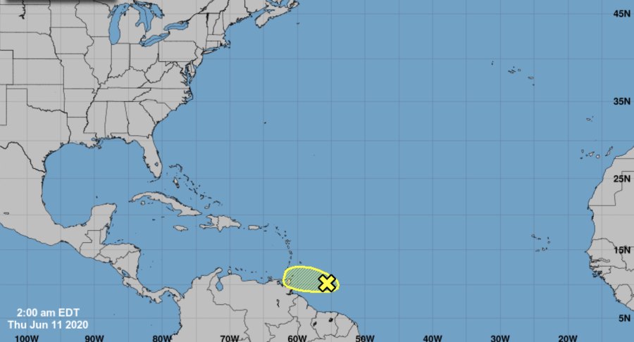 According to NHC, although significant development is not expected due to dry air and adverse upper-level winds, some areas of heavy rain and gusty winds are possible across portions of the Windward Islands later today through early Friday while the wave moves westward at 15 to 20 mph.