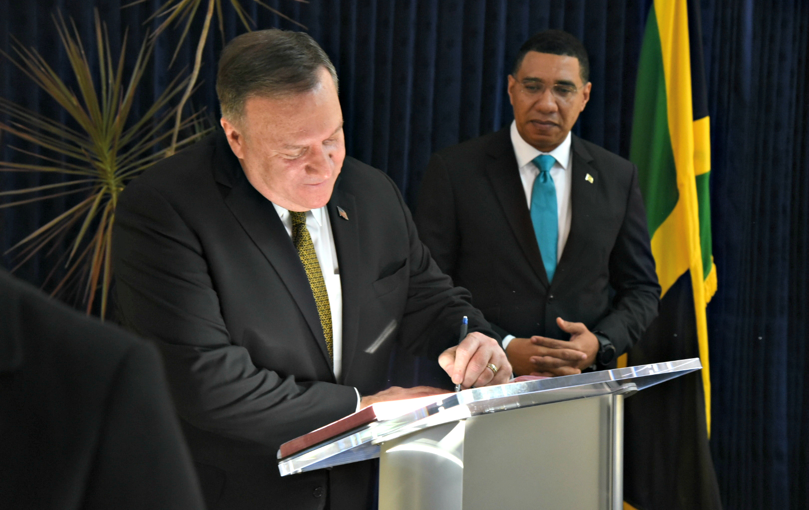 U.S. Secretary of State Mike Pompeo signs Jamaican guestbook during visit to island between Jan. 21-22, 2020 Photo Credit: GOVERNMENT OF JAMAICA
