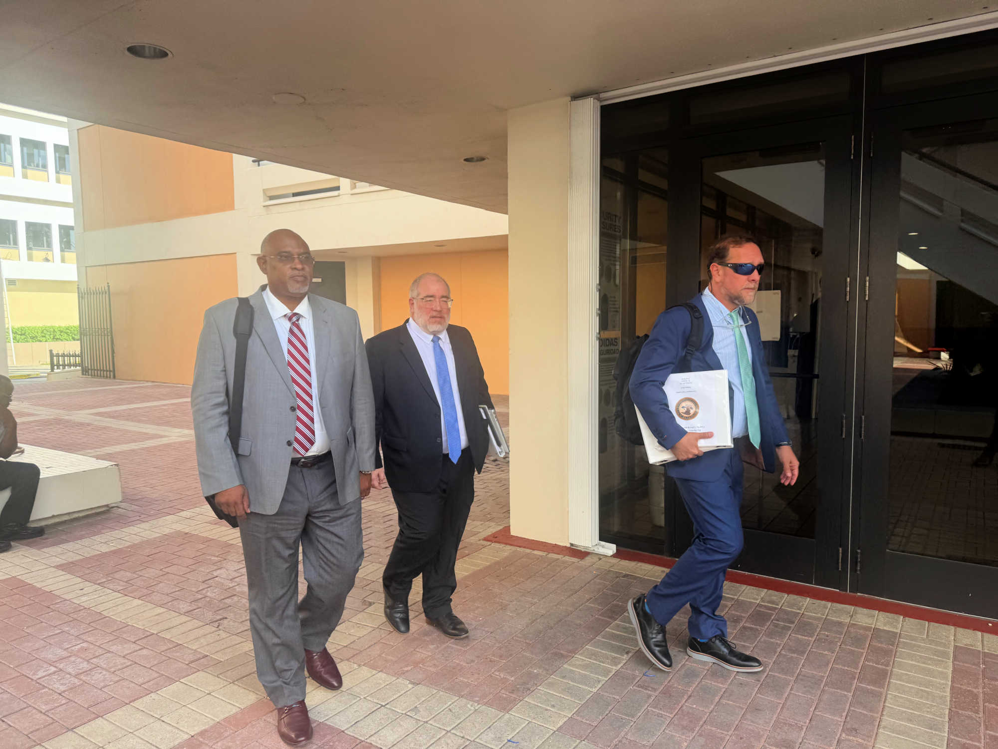 Former Police Commissioner Ray Martinez, left, and his attorneys following today's opening trial. (Credit: Ernice Gilbert, V.I. Consortium)