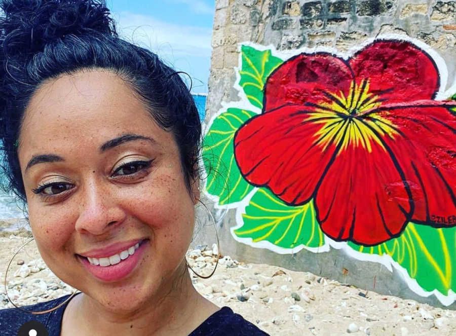 Artist Ibeliz Guadelupe covers a graffiti tag with a vibrant red hibiscus. Photo Credit: FREDERIKSTED PUBLIC ART ON INSTAGRAM