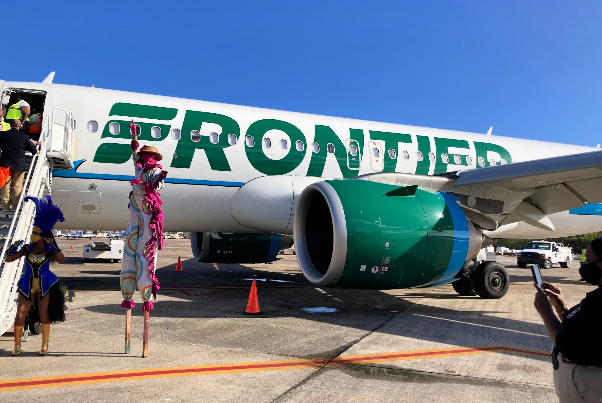 V.I. Dept. of Tourism greeters welcome Frontier Airlines inaugural flight to St. Thomas, USVI on Friday, Feb. 19, 2021 Photo Credit: KYLE MURPHY FOR V.I. CONSORTIUM
