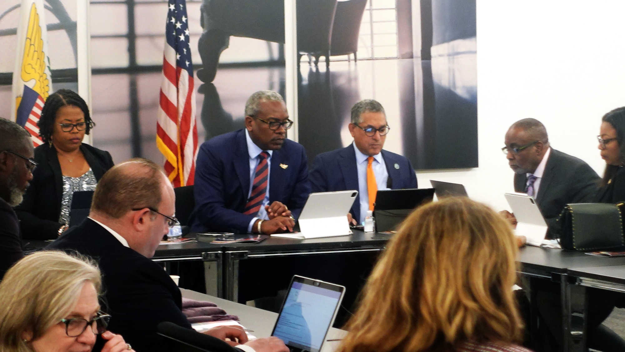 Gov. Albert Bryan, PFA Legal Counsel Kye Walker (left), Gov't House Chief Legal Counsel David Bornn and PFA Exec. Dir. Nathan Simmonds (right) attend the closing of the bond sale in Washington, D.C. to stabilize GERS on Wednesday, April 6. Photo Credit: GOV'T HOUSE