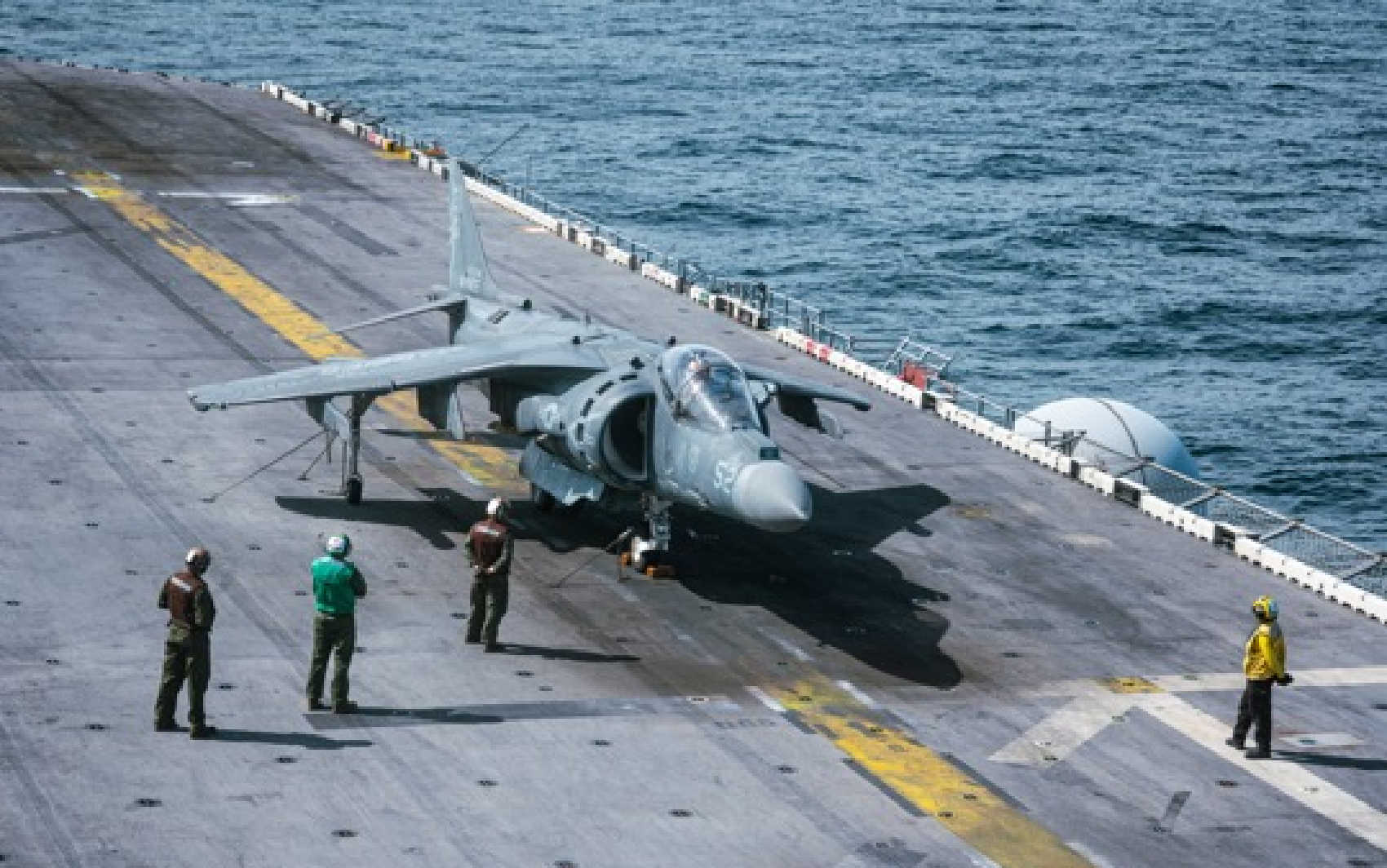 U.S. Marines perform maintenance on AV-8B Harrier aircraft aboard the USS Iwo Jima (LHD 7) while operating in the Caribbean Sea on September 18, 2025. Photo Credit: U.S. SOUTH COMMAND.