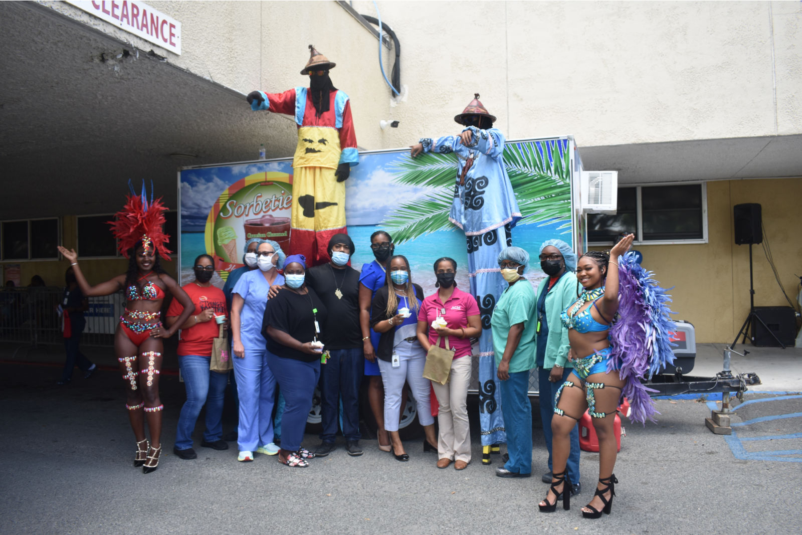 A table near the hospital's entrance on which Tourism-marked masks for protection against Covid-19 were placed, along with other items such as bags, pens and some bite-sized sweets, was positioned near Sorbetiere VI, which served ice cream for employees who had formed a line. DJ Swain shuffled the best of Caribbean music, Moko Jumbies performed their signature routines and were joined by some employees during the fun-filled affair. Later, dancers from Kaiso Entertainment brought additional flare to the event.