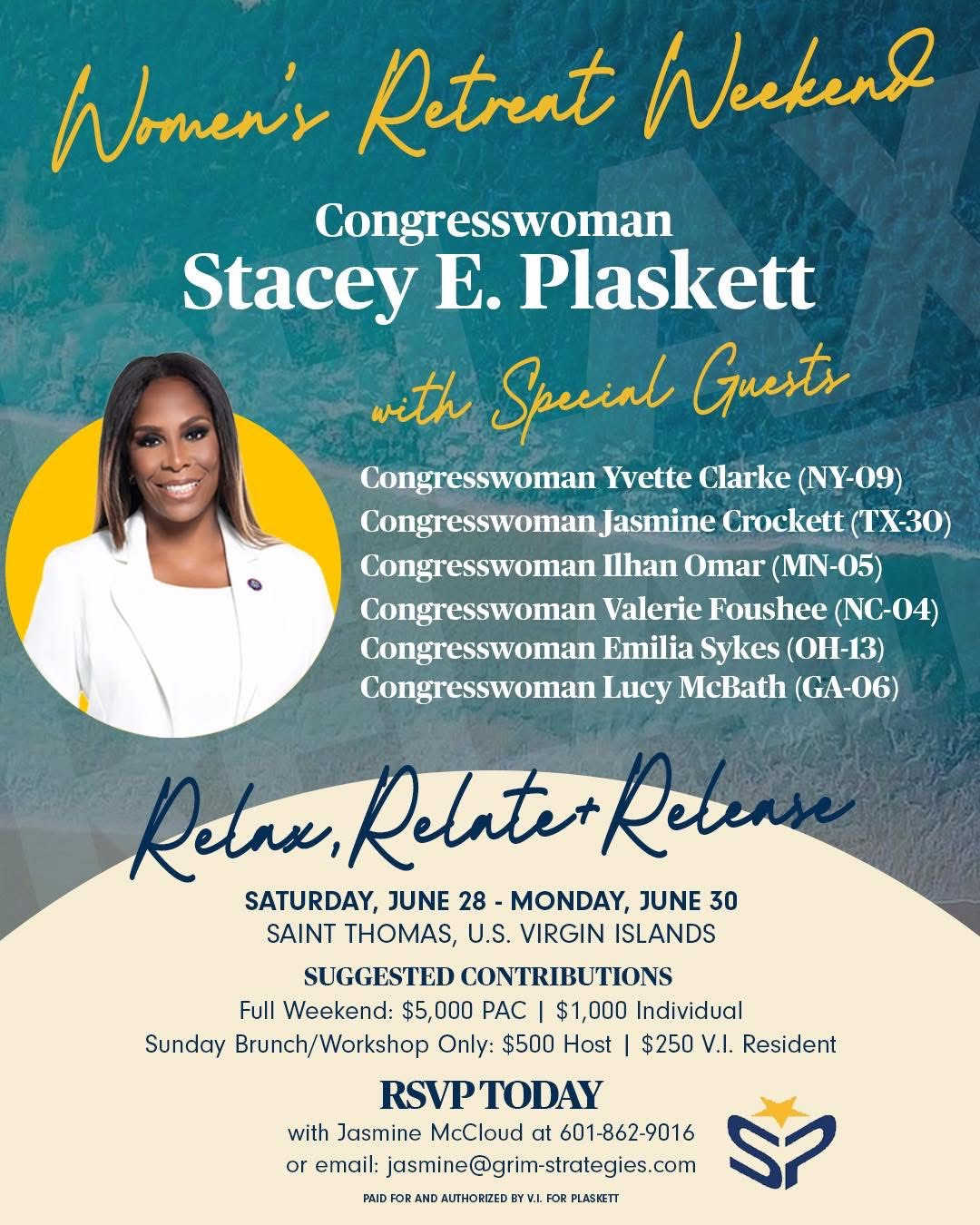 Congresswoman Stacey Plaskett will host a select group of national female lawmakers in the U.S. Virgin Islands this weekend for a wellness-focused retreat centered on empowerment, networking, and community engagement.
