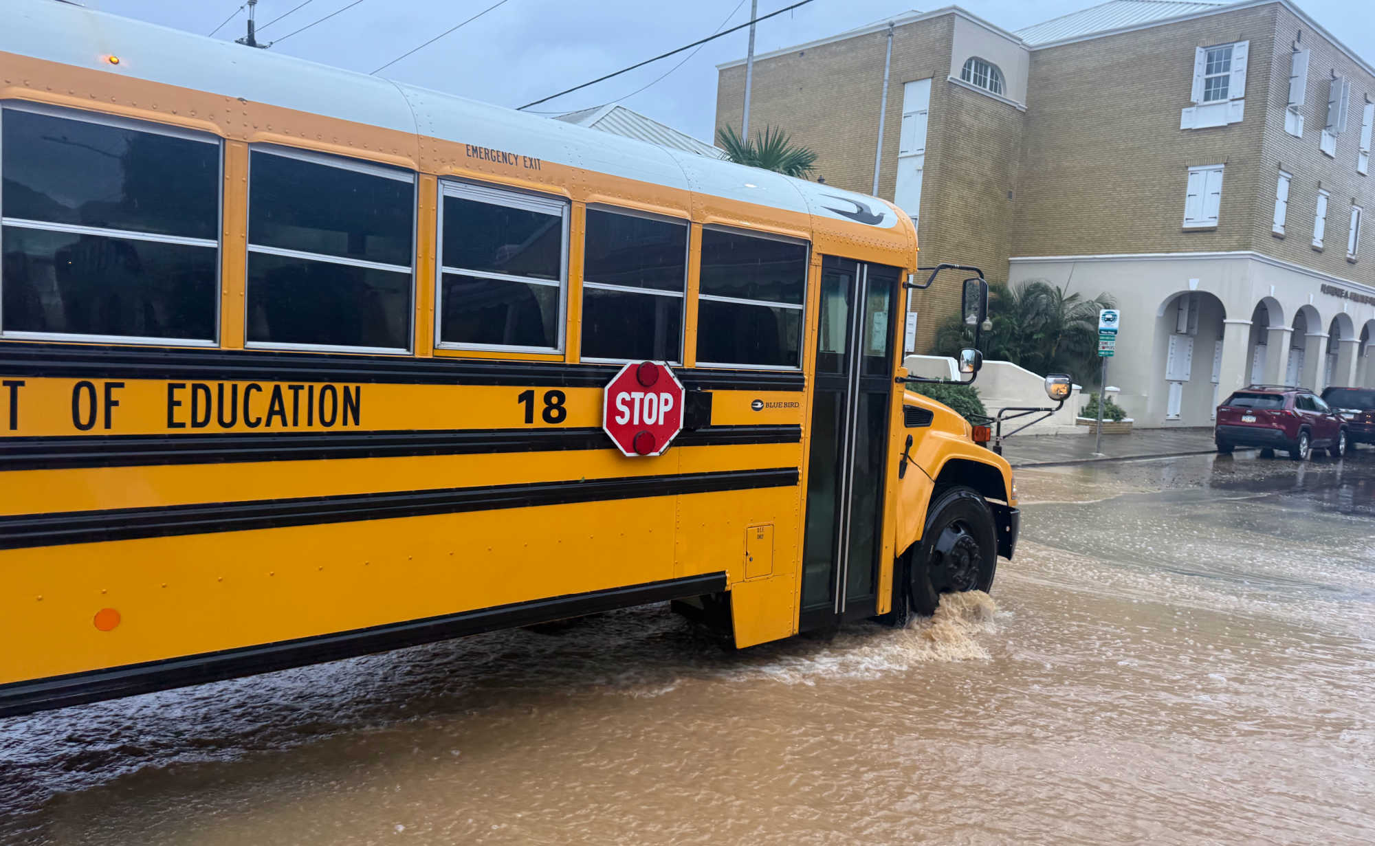 A school bus navigates floodwaters in downtown Christiansted near the Florence Williams Public Library on Thursday, September 18, 2025. Photo Credit: ERNICE GILBERT, V.I. CONSORTIUM.