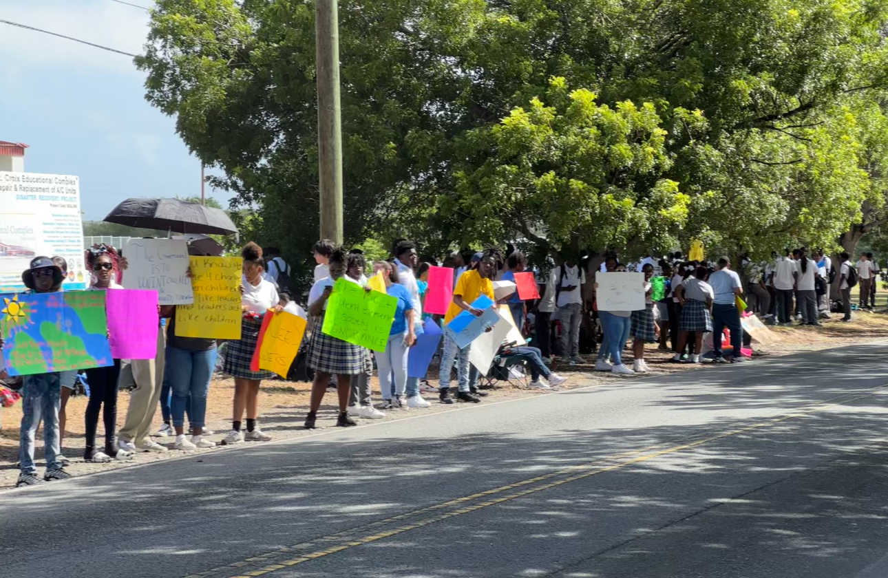 On Monday, they gathered on the grounds of the St. Croix Educational Complex, near the roadside, protesting learning conditions as they did on Friday. They called for immediate action by those in authority, including Dept. of Education Commissioner Dr. Dionne Wells-Hedrington, and Governor Albert Bryan. They also assailed two senators who stopped by to address the students.