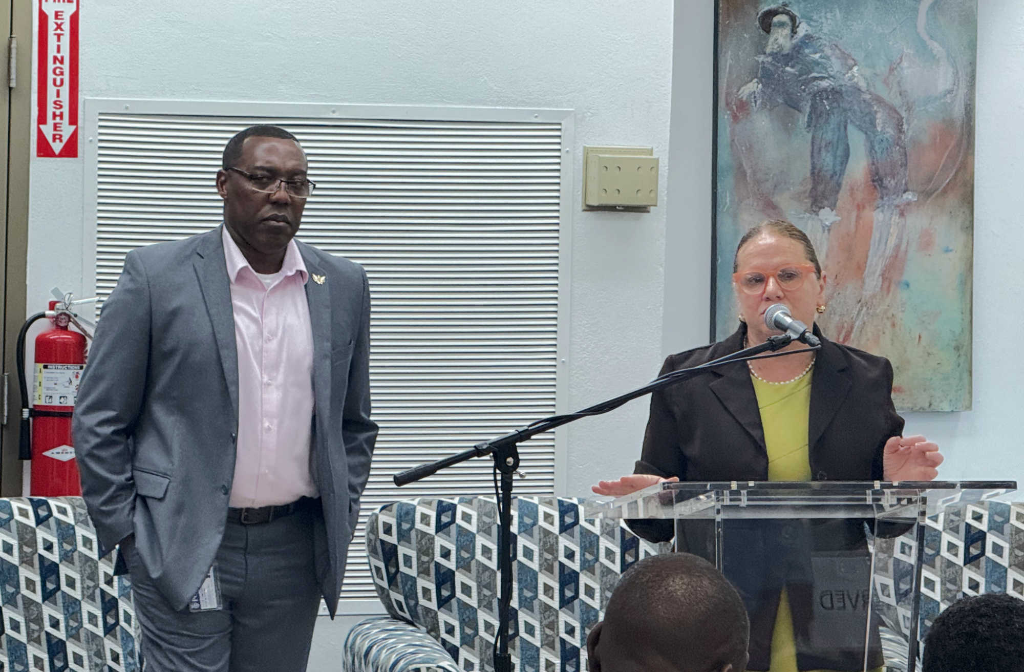 Police Commissioner Mario Brooks and Health Commissioner Justa Encarnacion speak during Wednesday’s town hall at the Florence Williams Public Library in downtown Christiansted. Photo Credit: ERNICE GILBERT, V.I. CONSORTIUM
