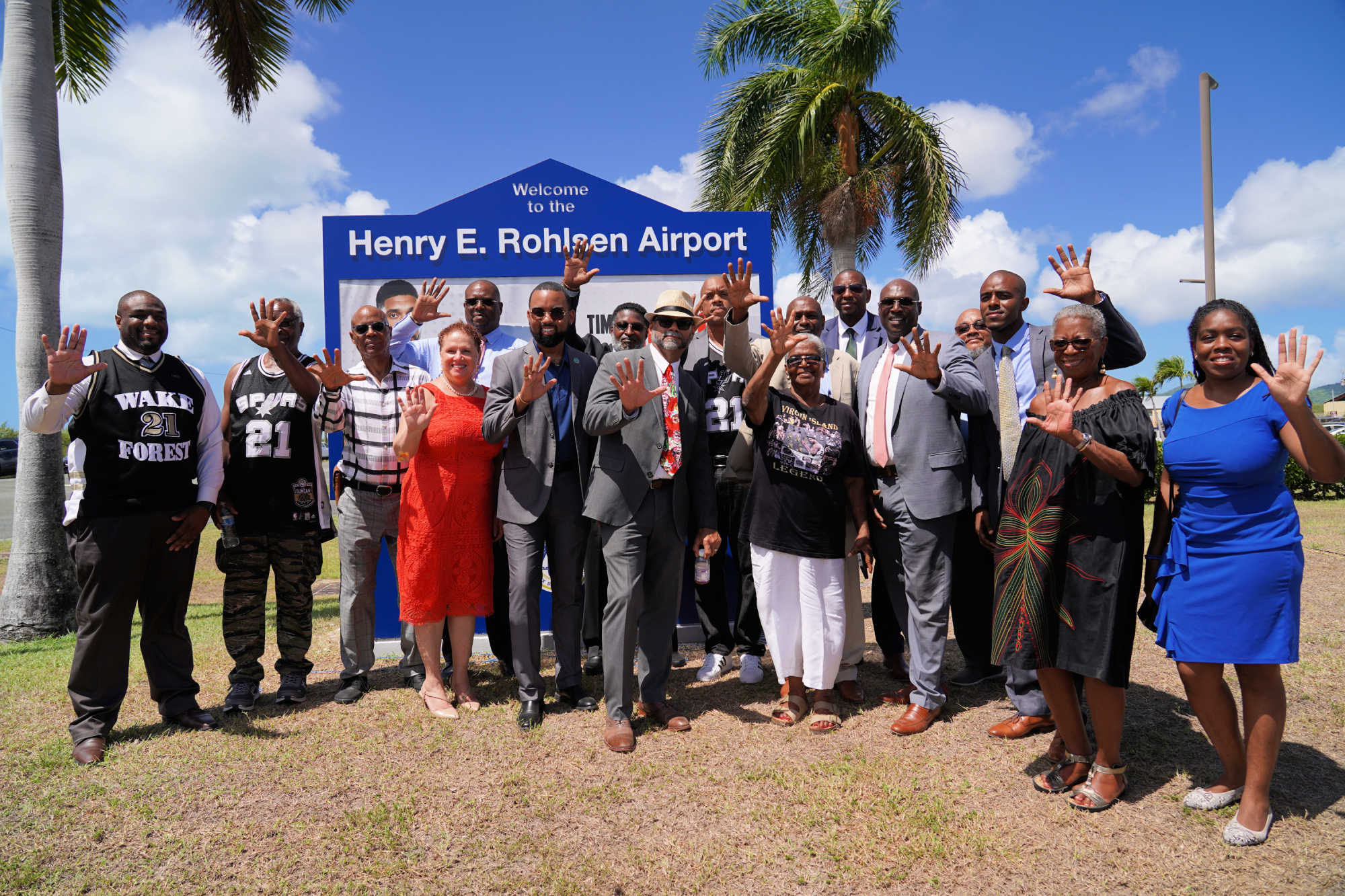 Local officials and people with personal connections to Tim Duncan, along with fans on Thursday, Sept. 28, 2023 posed for a picture in front of the newly erected sign at the Henry E. Rohlsen Airport on St. Croix. Photo Credit: ERNICE GILBERT, V.I. CONSORTIUM
