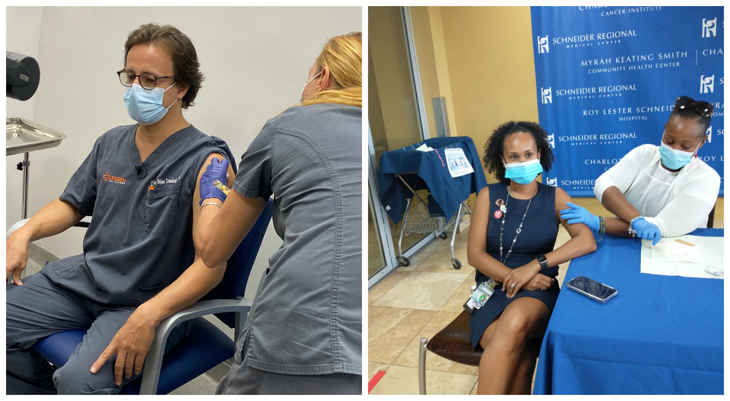 Left: Registered Nurse Hope Bagley delivered the first shot to Dr. Jan Tawakol of Plessen Healthcare on St. Croix. Right: Registered Nurse Beranice Wade of Schneider Hospital delivered the first shot to the D.O.H.'s Medical Director Dr. Tai Hunte-Ceasar. Photo Credit: THE VIRGIN ISLANDS DEPARTMENT OF HEALTH