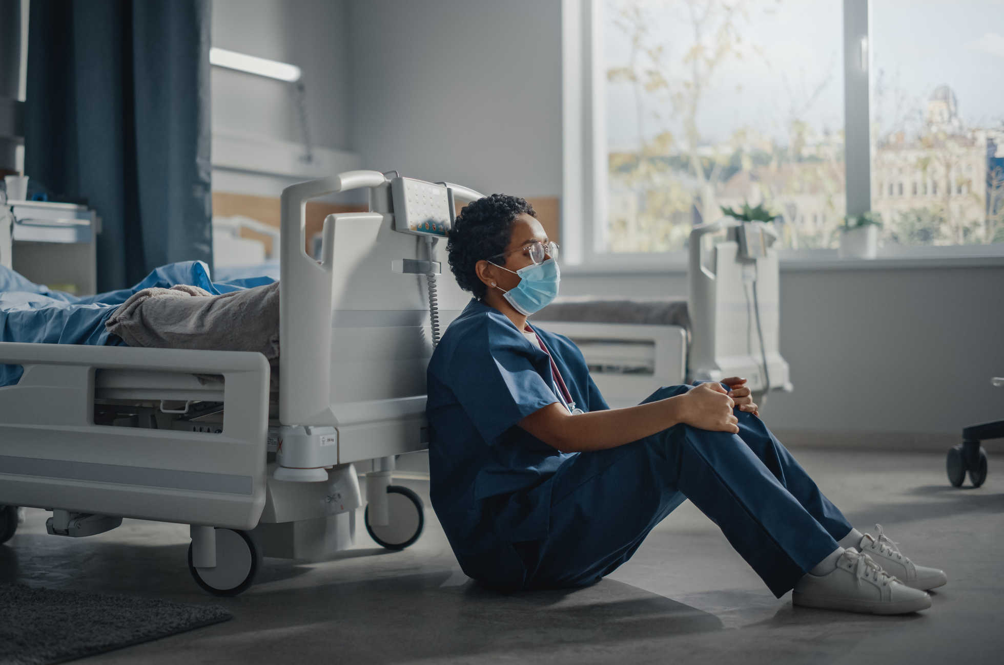 Hospital intensive care coronavirus ward: portrait of tired nurse wearing face mask sitting on the floor. Photo Credit: GETTY IMAGES