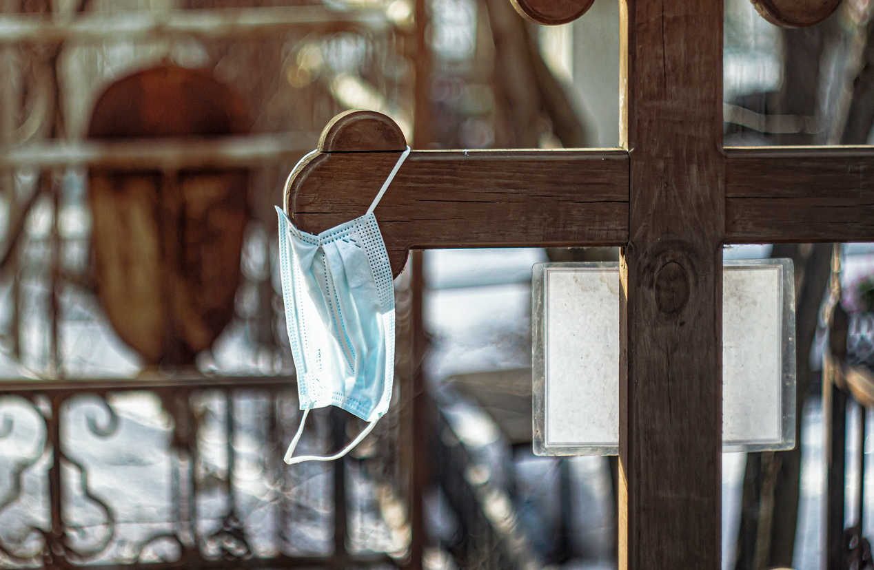 A medical mask hangs on a funeral cross. Photo Credit: GETTY IMAGES
