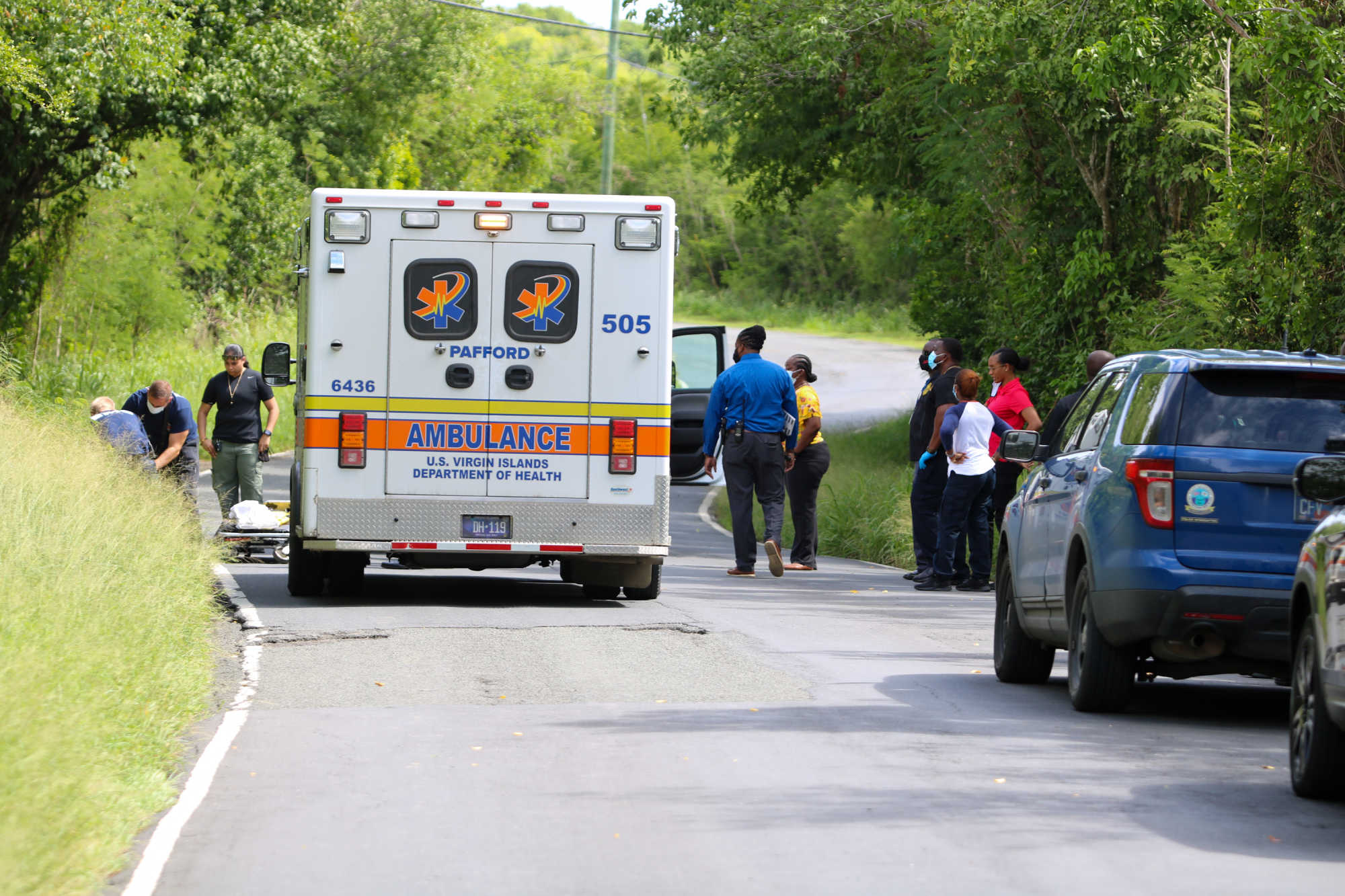 VIPD detectives, Emergency Medical Technicians, and personnel from the Virgin Islands Department of Justice on North Shore Road, where 56-year-old John Silcott was found deceased. Photo Credit: VI CONSORTIUM