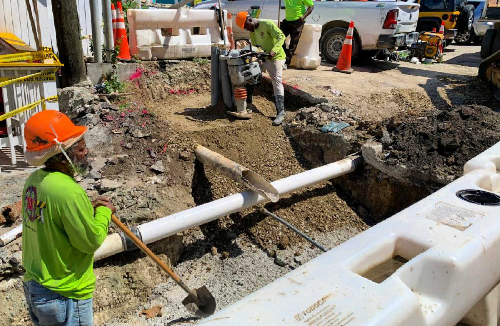 Workers compact the ground in February 2022 for the installation of an electrical transformer pad in Cruz Bay, St. John. WAPA plans to make St. John's power grid more resilient with the burying of electrical lines in Cruz Bay. Photo Credit: FEMA/ERIC ADAMS