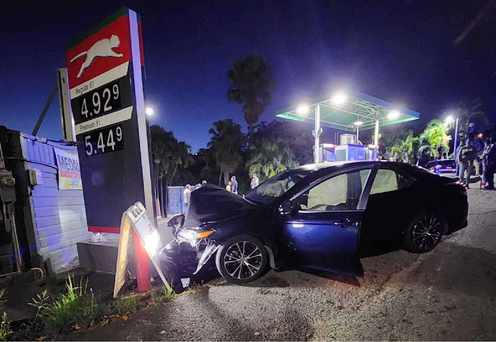 Emergency services were alerted to the accident by a 911 call. Responding to the scene, officers found a 2019 Toyota Camry that had collided with a concrete pole in front of the Nadal Grocery sign.