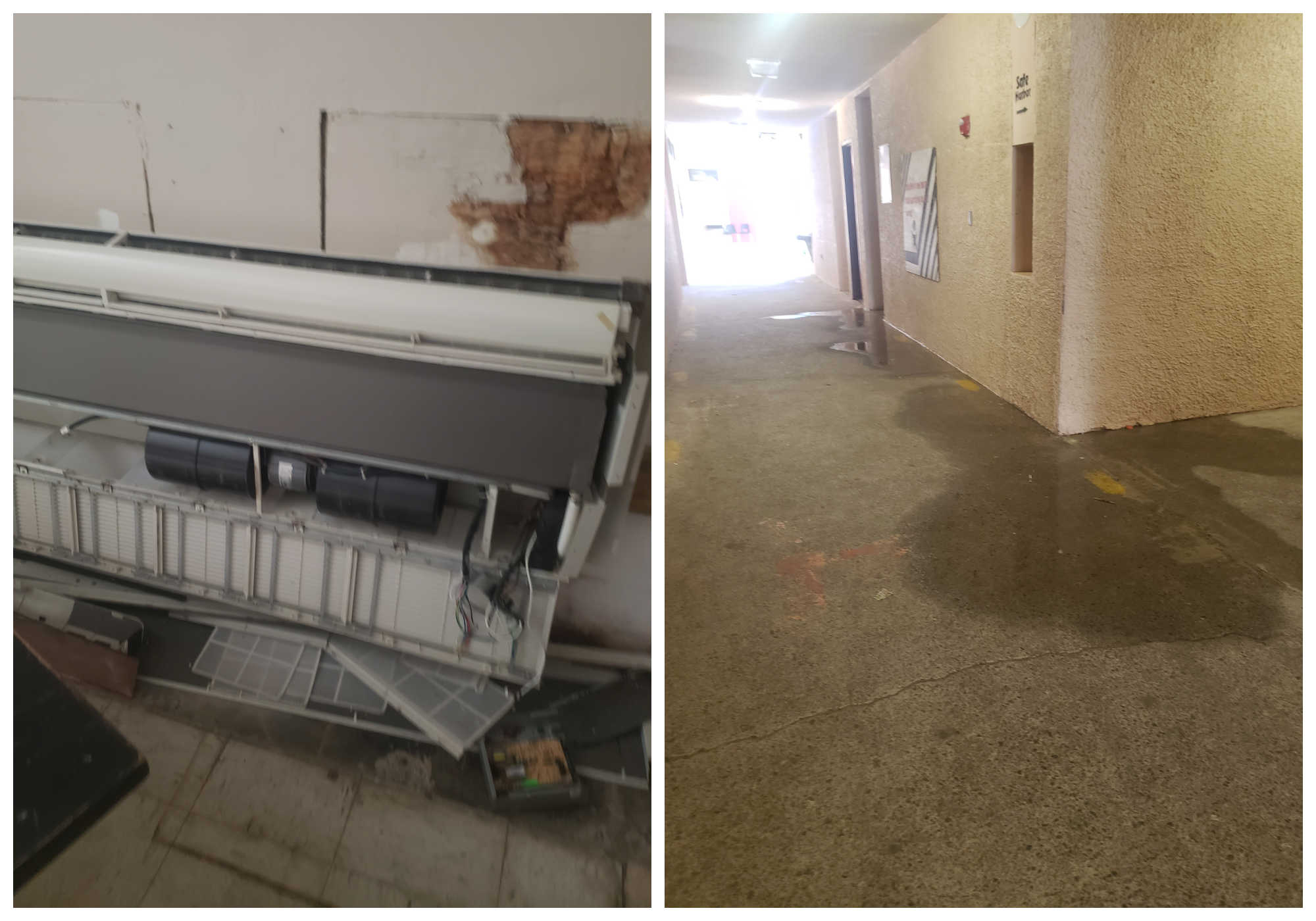 A nonfunctional AC unit and wet floor at the John H. Woodson Jr. High School, Photo Credit: V.I. CONSORTIUM