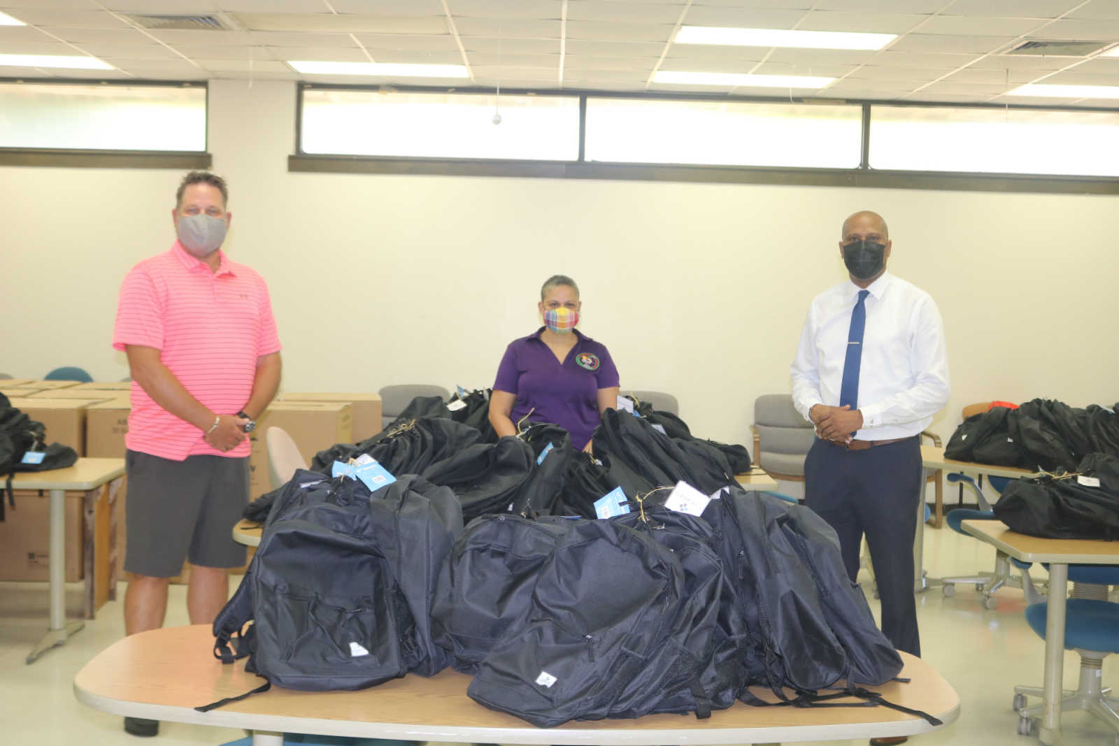 St. Croix Christian Church Pastor David Claeys (L) presents 250 backpacks filled with school and safety supplies to St. Croix District Director of Curriculum & Instruction Pedro Parrilla (R) and St. Croix District English Language Arts Coordinator Paulina Photo Credit: V.I. DEPT. OF EDUCATION