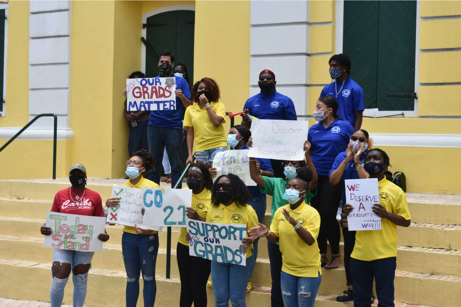 St. Croix Central High and Educational Complex students protested outside Gov’t House on St. Croix on Sat. May 8, 2021, displeasured by the Dept. of Education’s alleged flip-flopping on in-person graduation plans to settle on a drive-thru setup. Photo Credit: KYLE MURPHY FOR VI CONSORTIUM