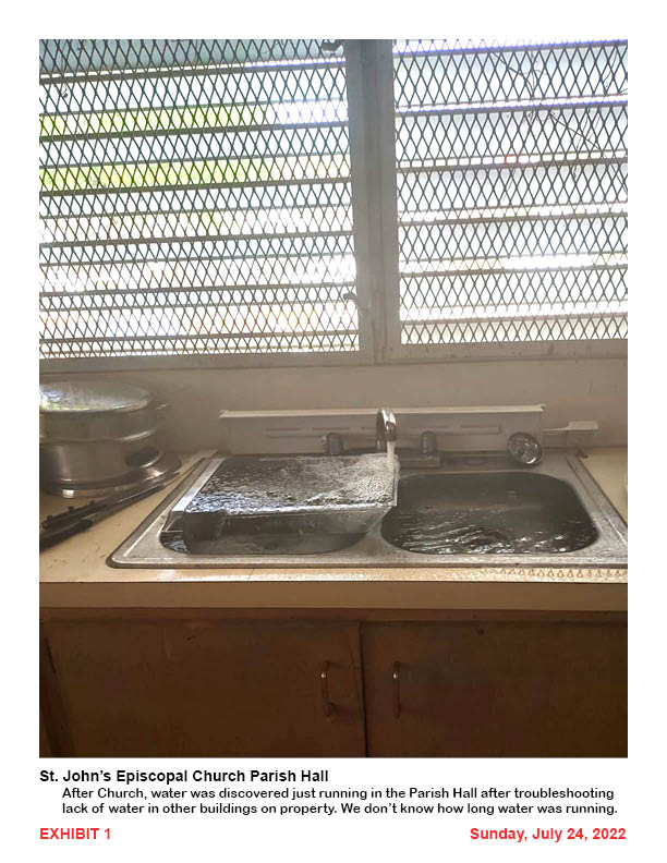 Exhibit 1 (July 24, 2022): Parish Hall sink running; church says the building below was flooded.