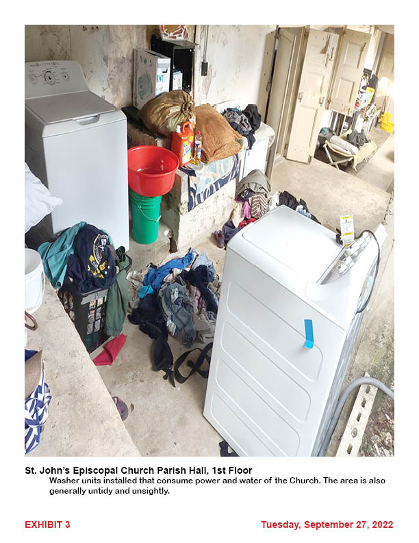 Exhibit 3 (Sept. 27, 2022): First floor with washers and laundry; caption says units “consume power and water of the Church” and the area is “generally untidy and unsightly.”