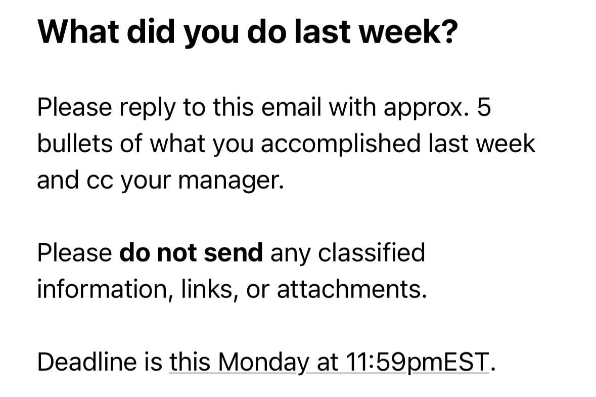 Consistent with President @realDonaldTrump’s instructions, all federal employees will shortly receive an email requesting to understand what they got done last week. Failure to respond will be taken as a resignation,” Musk said on X Saturday.
