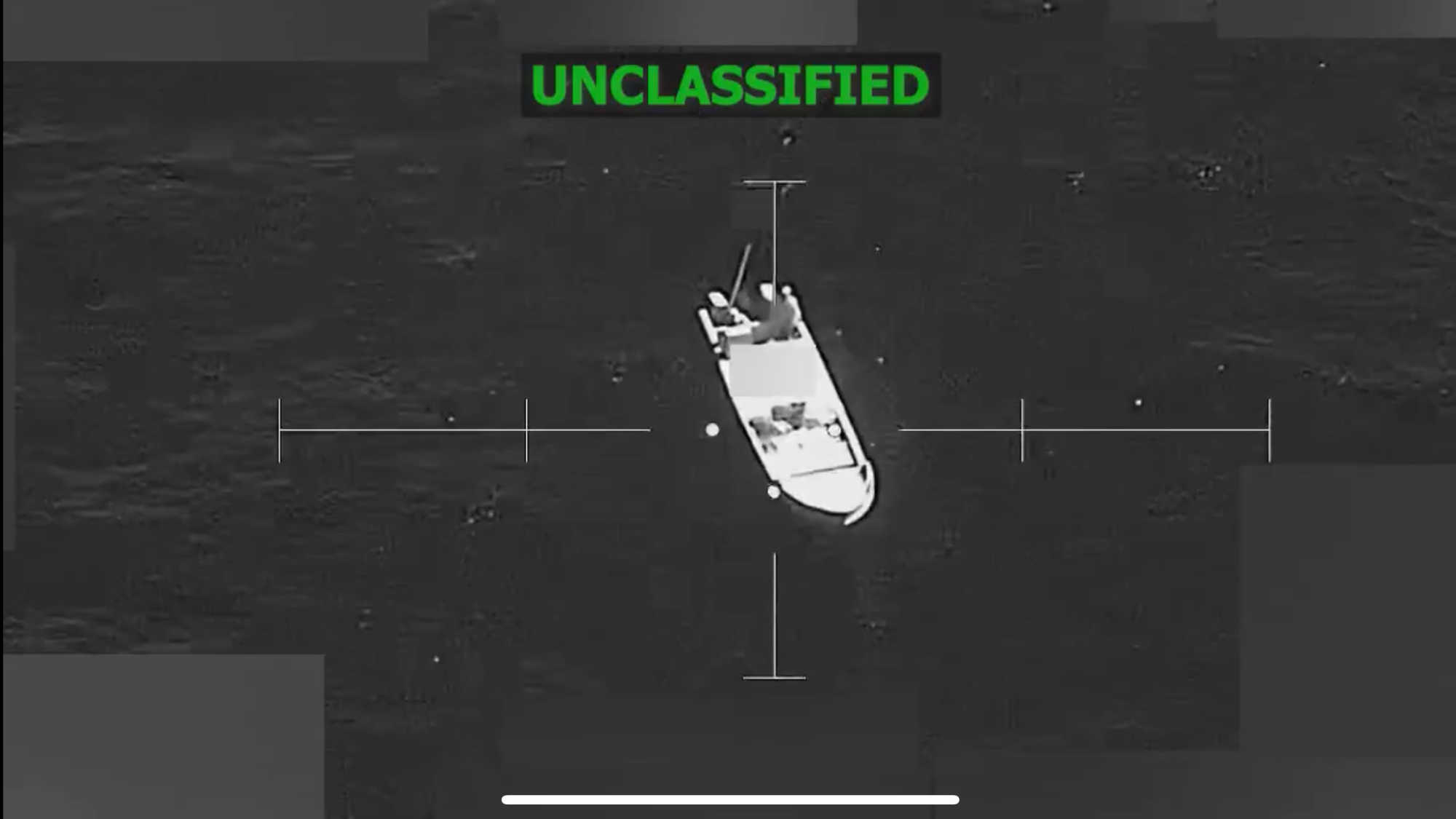 Aerial surveillance image showing a small vessel operating in open waters along a known narco-trafficking route in the Eastern Pacific, captured during U.S. counter-drug operations tied to Joint Task Force Southern Spear. Photo Credit: U.S. SOUTH COMMAND.