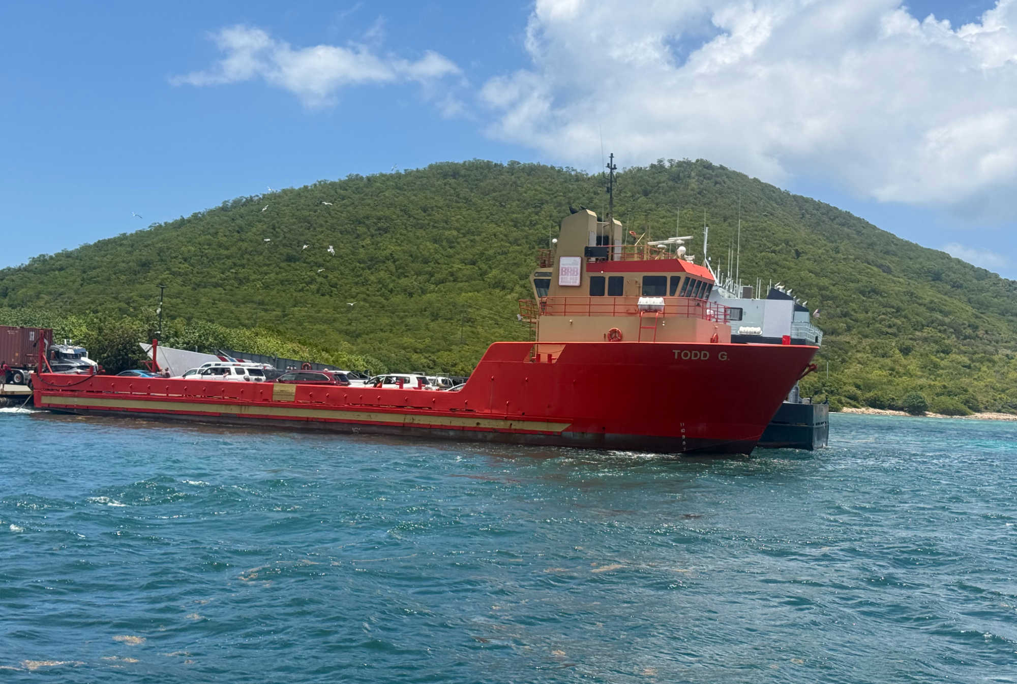 A St. John barge transports vehicles across Pillsbury Sound — a vital daily connection for residents, as the Virgin Islands Port Authority prepares to implement its revised, community-informed marine fee schedule in 2026. Photo Credit: ERNICE GILBERT, V.I. CONSORTIUM