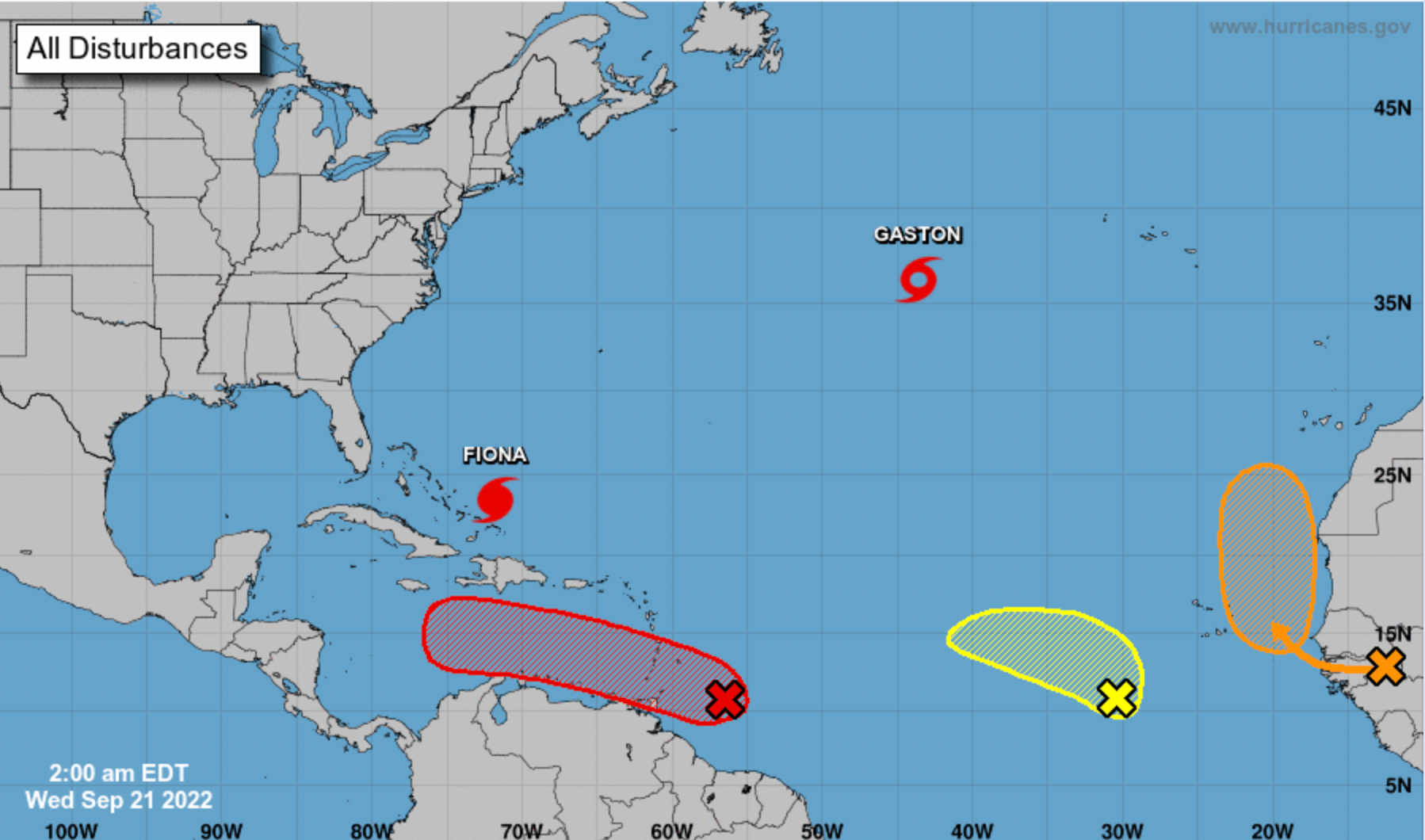 While there are currently several weather systems churning in the Atlantic, with a total of five — including Cat. 4 Hurricane Fiona and Tropical Storm Gatson — being tracked by the National Hurricane Center, none of these systems currently pose a threat to the U.S. Virgin Islands, according to N.H.C. tracking data.