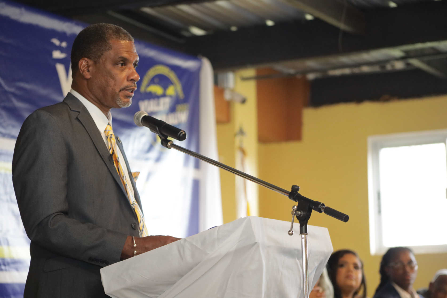 Standing at a podium erected on a stage at Blue Bambou (formerly the New Drive Inn located in Grove on St. Croix), Mr. Vialet spoke of what he said was the poor state of the territory's education system, health care, and stalled disaster recovery. He chided the governor for attempting to make his own what Mr. Vialet said were combined legislative and executive branch efforts, the most important of those items being the Government Employees' Retirement System measure that essentially staved off collapse of the pension system.