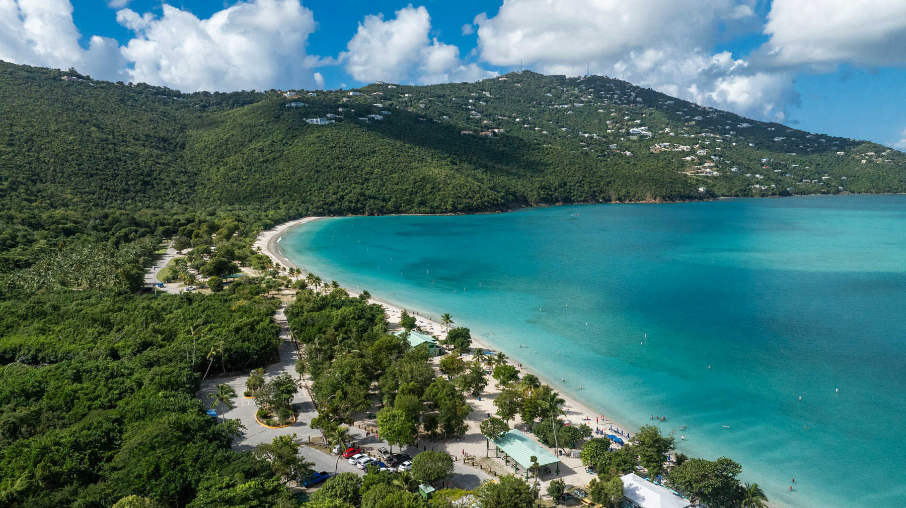 An aerial shot of Magens Bay beach in St. Thomas, boasting 1.5 million visitors annually.