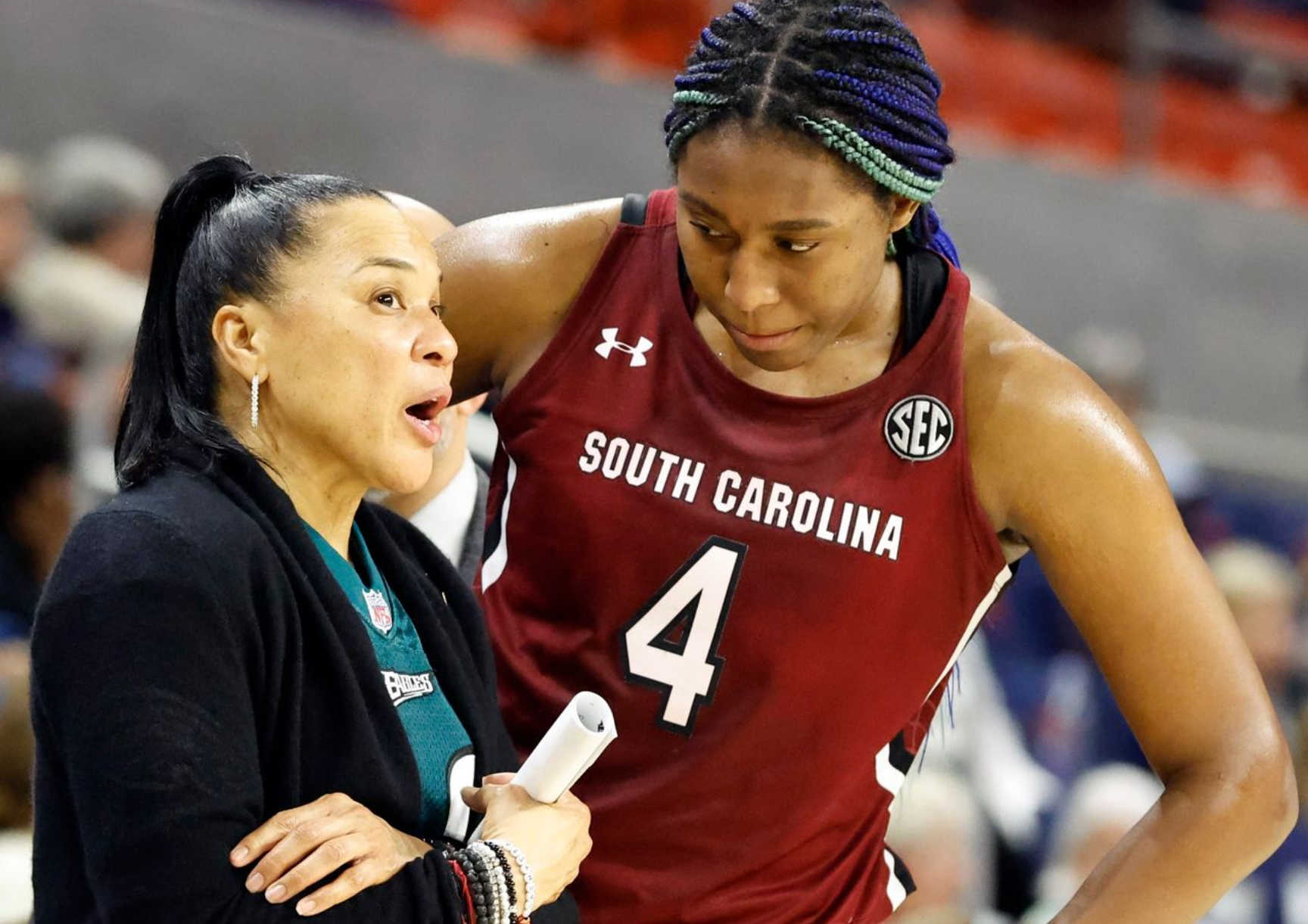 South Carolina coach Dawn Staley, left, talks with star forward Aliyah Boston, a native of St. Thomas, U.S. Virgin Islands. Photo Credit: AP.