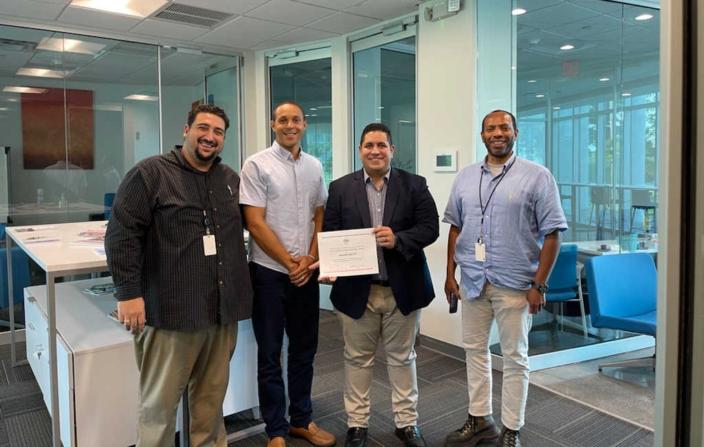 Accelerate VI Team Members Receive GAFC Award from an SBA Representative. From left to right: Alfonso Rodriguez, Eric Sonnier, Josue E. Rivera (SBA District Director), and Peter Chapman. Photo Credit: RTPARK