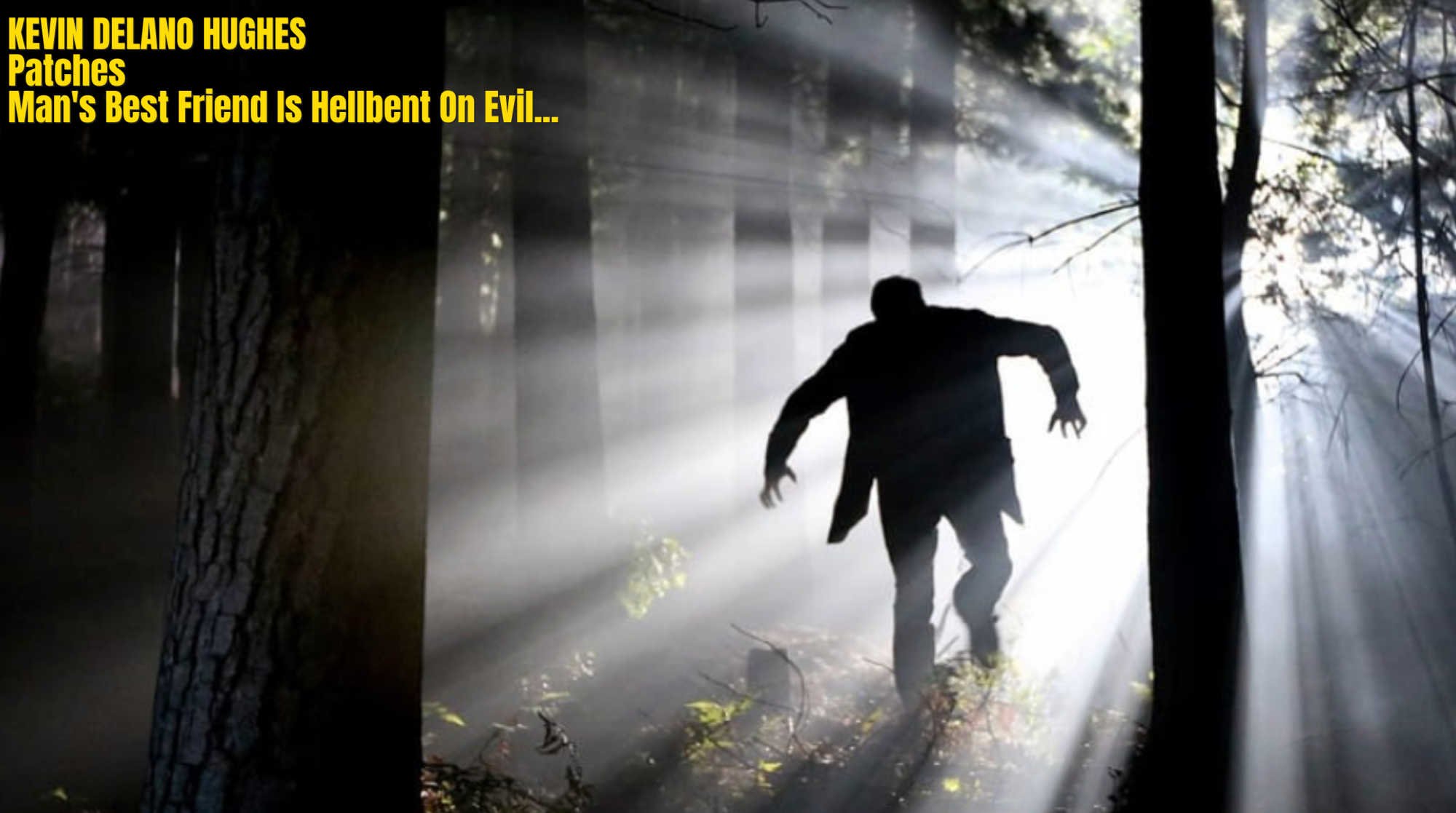 A silhouetted figure runs through a dark, fog-filled forest pierced by beams of light, reflecting the ominous tone of Patches, Kevin Delano Hughes’ supernatural horror novel about a family pet with a sinister secret.