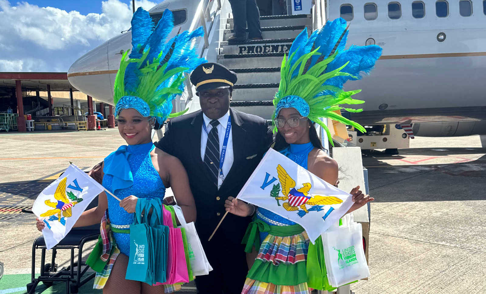 V.I. Dept. of Tourism greeters with UA Pilot Sheldon Martin at the Cyril E. King Airport on Wed. Nov. 30, 2022. Photo Credit: ERNICE GILBERT, V.I. CONSORTIUM.