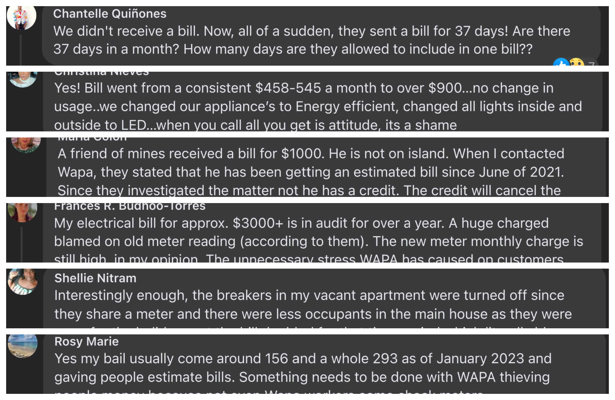 A collage of complaints from Virgin Islanders who say they have been receiving inconsistent power bills from WAPA. Photo Credit: V.I. CONSORTIUM