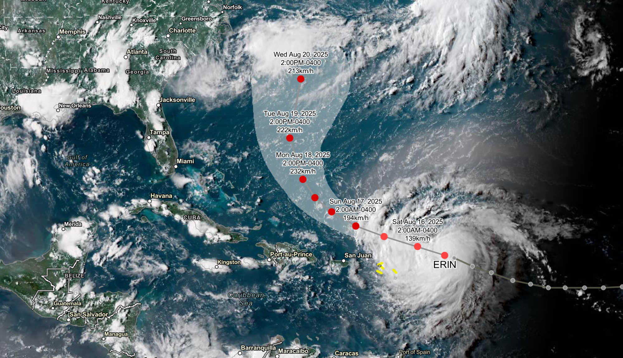 Although a direct landfall is not expected, Erin’s size means its outer rainbands could bring periods of heavy rainfall, gusty winds, and dangerous marine conditions to the territory. The NHC warns that rainfall totals of 2–4 inches, with isolated amounts up to 6 inches, are possible from Friday night through Sunday across the northern Leeward Islands, the Virgin Islands, and Puerto Rico. Localized flash flooding, urban flooding, and landslides are possible, particularly in mountainous or poorly drained areas.